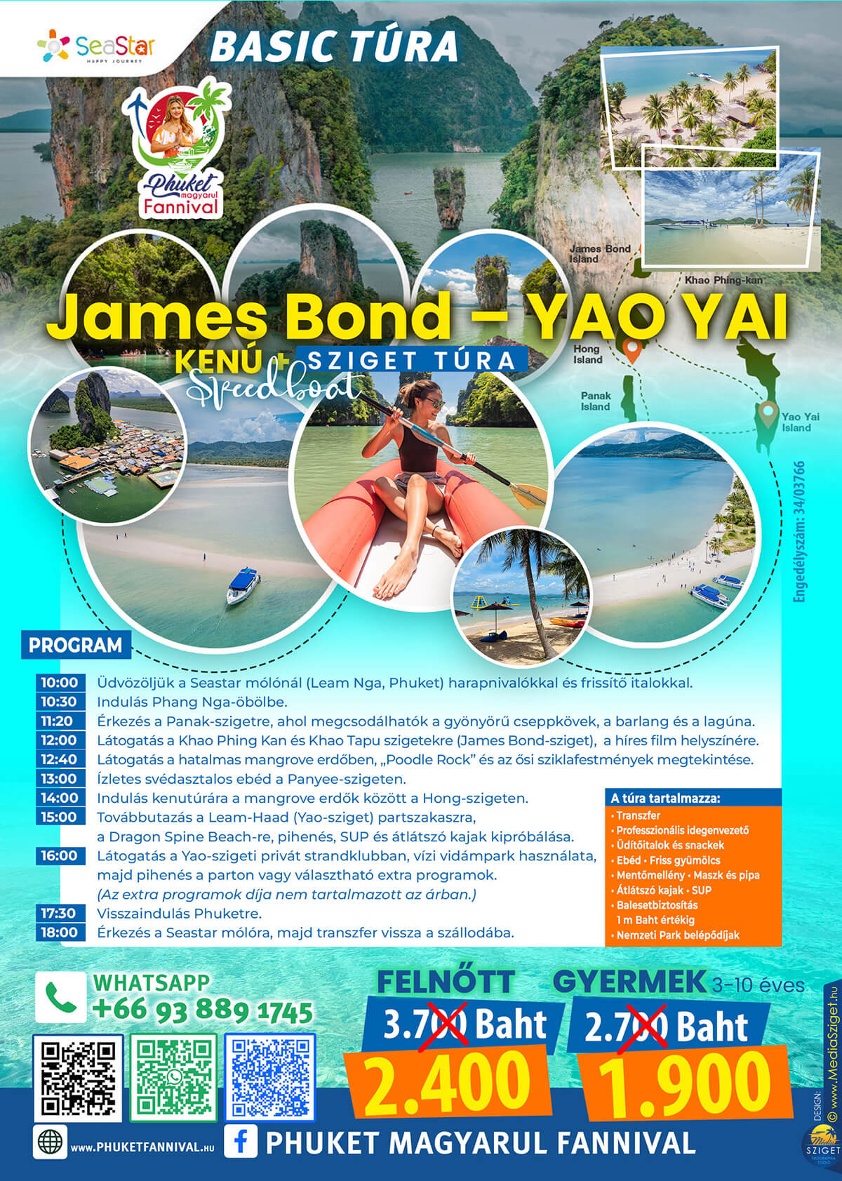 12:00 Látogatás a Khao Phing Kan és Khao Tapu szigetekre (James Bond-sziget), a híres film helyszínére.