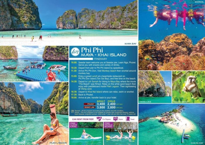 A túra tartalmazza: • Transzfer • Professzionális idegenvezető • Üdítőitalok és snackek • Friss gyümölcs • Ebéd • Mentőmellény • Maszk és pipa • Átlátszó kajak • SUP • Balesetbiztosítás 1 m Baht értékig • Nemzeti Park belépődíjak