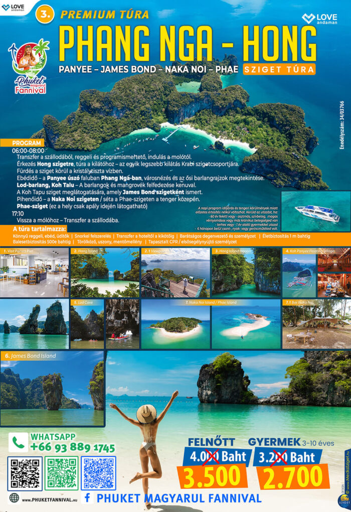 - Érkezés Hong szigetre, túra a kilátóhoz – az egyik legszebb kilátás Krabi szigetcsoportjára. Fürdés a sziget körül a kristálytiszta vízben.