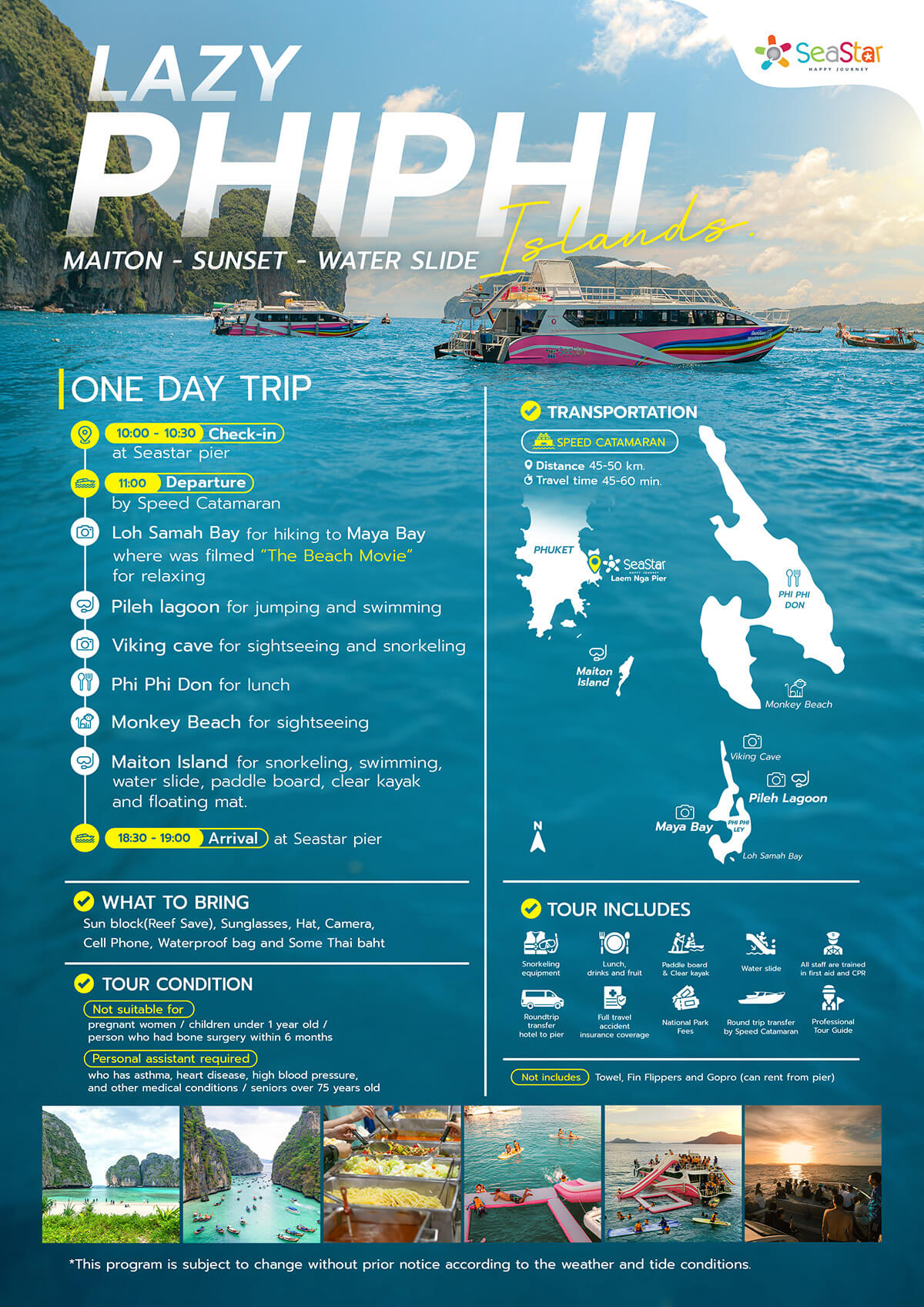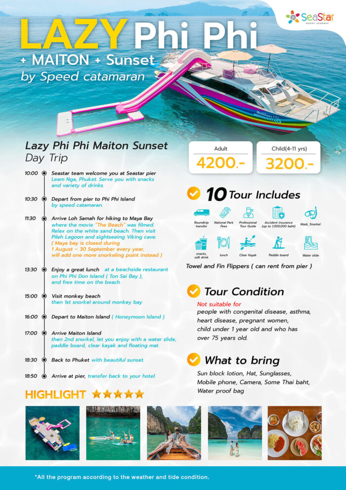 A program egy egész napos, pörgős tengeri túra Phuketből, amely magába foglalja a híres Phi Phi-szigetek, a rejtett lagúnák és a Maiton-sziget (Nászutas-sziget) felfedezését. Az utazás tartalmazza a szükséges transzfert, ebédet, és két sznorkelezési lehetőséget vízi sport eszközökkel és egy naplemente megtekintését is.