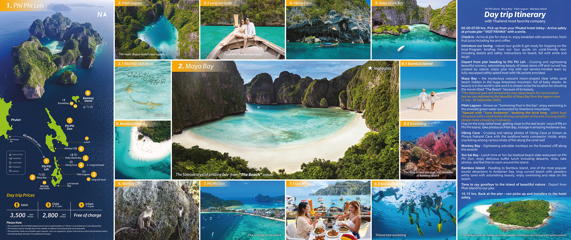 A túra tartalmazza: Könnyű reggeli, ebéd, üdítők | Nemzeti park belépő | Snorkel felszerelés | Egynapos kirándulás speedboattal Transzfer a hoteltől a kikötőig | Barátságos degenvezető és személyzet | Életbiztosítás 1 m bahtig Balesetbiztosítás 500e bahtig | Törölköző, uszony, mentőmellény | Tapasztalt CPR / elsősegélynyújtó személyzet