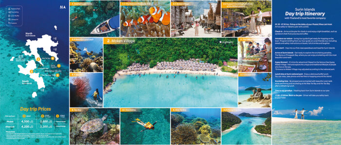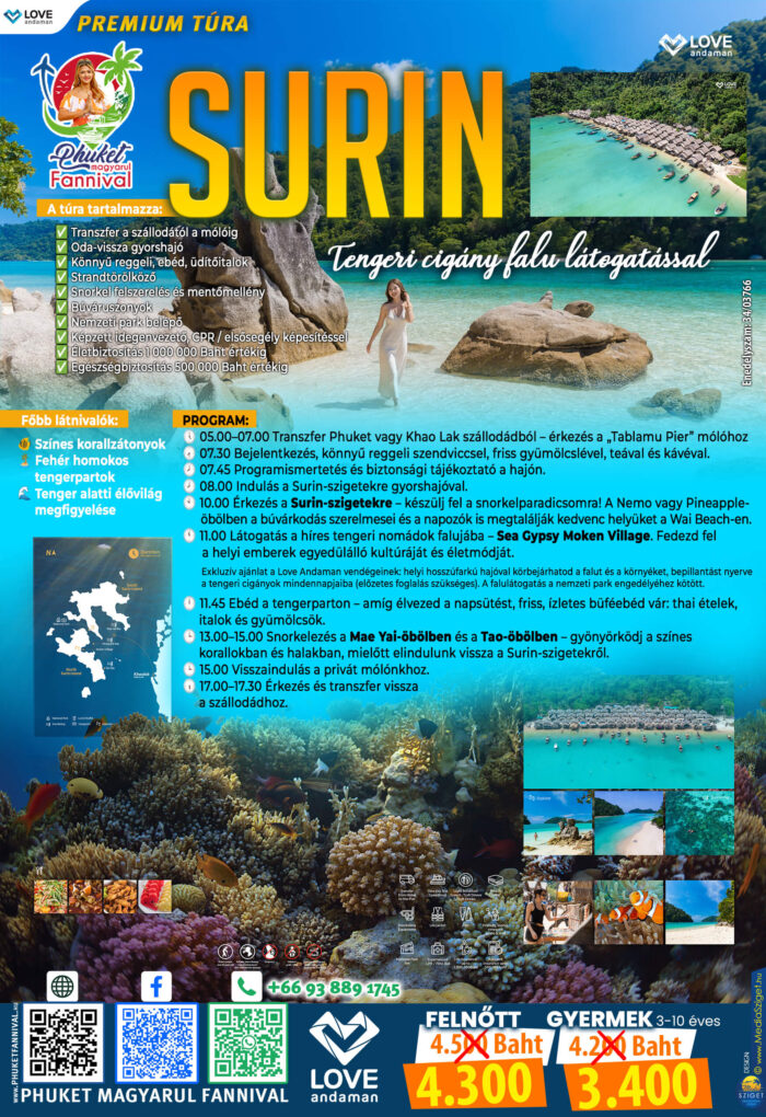 PROGRAM: 🕔 05.00–07.00 Transzfer Phuket vagy Khao Lak szállodádból – érkezés a „Tablamu Pier” mólóhoz 🕢 07.30 Bejelentkezés, könnyű reggeli szendviccsel, friss gyümölcslével, teával és kávéval. 🕗 07.45 Programismertetés és biztonsági tájékoztató a hajón. 🕗 08.00 Indulás a Surin-szigetekre gyorshajóval. 🕙 10.00 Érkezés a Surin-szigetekre – készülj fel a snorkelparadicsomra! A Nemo vagy Pineapple-öbölben a búvárkodás szerelmesei és a napozók is megtalálják kedvenc helyüket a Wai Beach-en. 🕚 11.00 Látogatás a híres tengeri nomádok falujába – Sea Gypsy Moken Village. Fedezd fel a helyi emberek egyedülálló kultúráját és életmódját. Exkluzív ajánlat a Love Andaman vendégeinek: helyi hosszúfarkú hajóval körbejárhatod a falut és a környéket, bepillantást nyerve a tengeri cigányok mindennapjaiba (előzetes foglalás szükséges). A falulátogatás a nemzeti park engedélyéhez kötött. 🕛 11.45 Ebéd a tengerparton – amíg élvezed a napsütést, friss, ízletes büféebéd vár: thai ételek, italok és gyümölcsök. 🕒 13.00–15.00 Snorkelezés a Mae Yai-öbölben és a Tao-öbölben – gyönyörködj a színes korallokban és halakban, mielőtt elindulunk vissza a Surin-szigetekről. 🕒 15.00 Visszaindulás a privát mólónkhoz. 🕠 17.00–17.30 Érkezés és transzfer vissza a szállodádhoz.