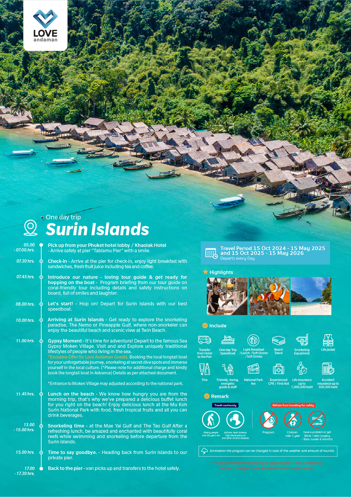 PROGRAM: 🕔 05.00–07.00 Transzfer Phuket vagy Khao Lak szállodádból – érkezés a „Tablamu Pier” mólóhoz 🕢 07.30 Bejelentkezés, könnyű reggeli szendviccsel, friss gyümölcslével, teával és kávéval. 🕗 07.45 Programismertetés és biztonsági tájékoztató a hajón. 🕗 08.00 Indulás a Surin-szigetekre gyorshajóval. 🕙 10.00 Érkezés a Surin-szigetekre – készülj fel a snorkelparadicsomra! A Nemo vagy Pineapple-öbölben a búvárkodás szerelmesei és a napozók is megtalálják kedvenc helyüket a Wai Beach-en. 🕚 11.00 Látogatás a híres tengeri nomádok falujába – Sea Gypsy Moken Village. Fedezd fel a helyi emberek egyedülálló kultúráját és életmódját. Exkluzív ajánlat a Love Andaman vendégeinek: helyi hosszúfarkú hajóval körbejárhatod a falut és a környéket, bepillantást nyerve a tengeri cigányok mindennapjaiba (előzetes foglalás szükséges). A falulátogatás a nemzeti park engedélyéhez kötött. 🕛 11.45 Ebéd a tengerparton – amíg élvezed a napsütést, friss, ízletes büféebéd vár: thai ételek, italok és gyümölcsök. 🕒 13.00–15.00 Snorkelezés a Mae Yai-öbölben és a Tao-öbölben – gyönyörködj a színes korallokban és halakban, mielőtt elindulunk vissza a Surin-szigetekről. 🕒 15.00 Visszaindulás a privát mólónkhoz. 🕠 17.00–17.30 Érkezés és transzfer vissza a szállodádhoz.