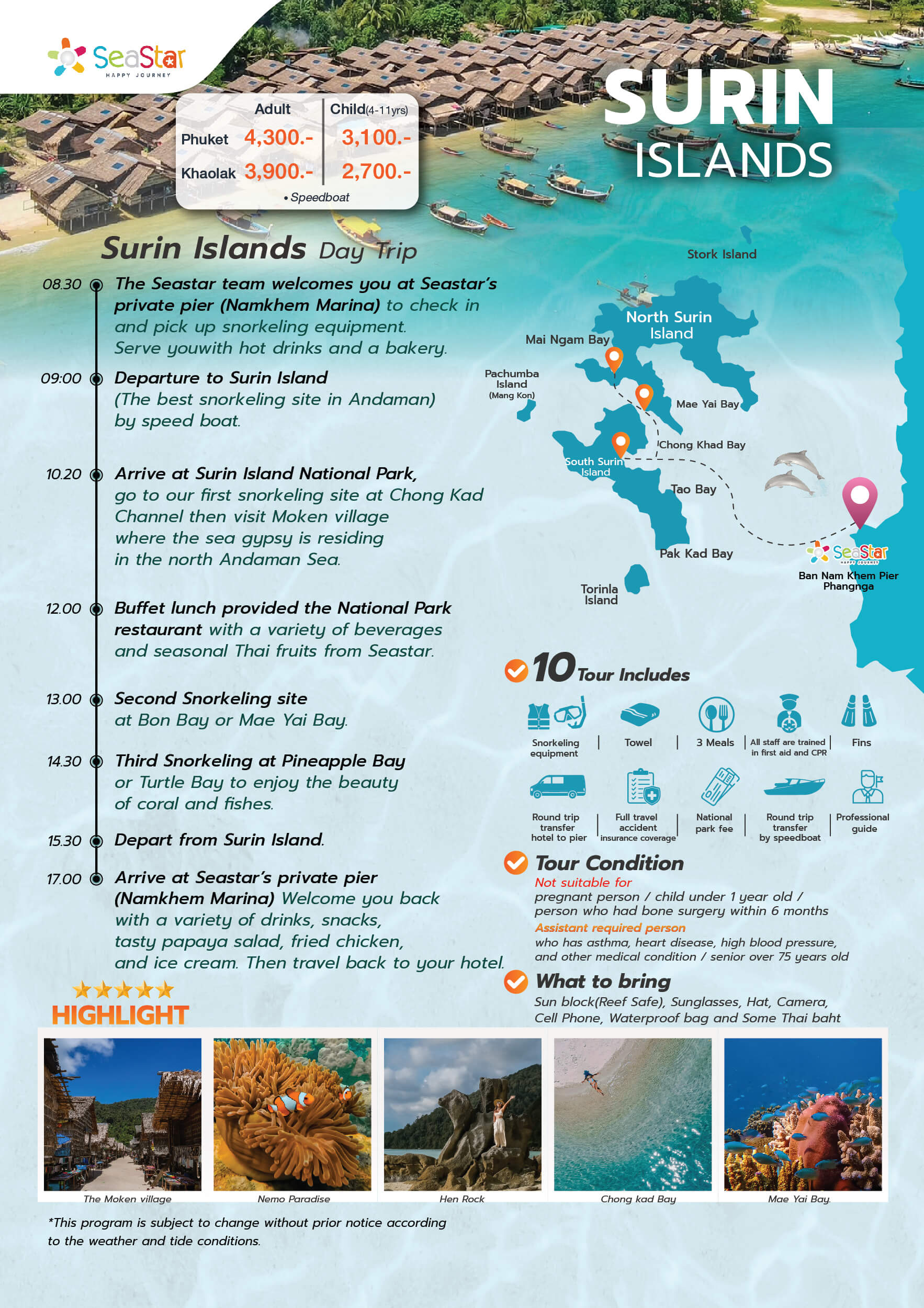 • 10.20 – Érkezés a Surin-szigetek Nemzeti Parkba. Első sznorkelezés a Chong Kad-csatornánál, majd látogatás a Moken faluba, az észak-andamán tengeri cigányok lakhelyére.
